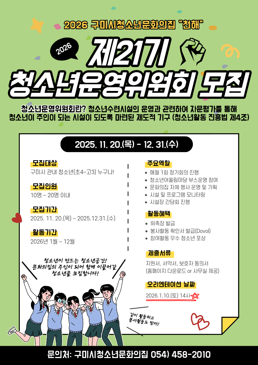 "2026년 구미시청소년문화의집을 함께 이끌어 갈 청소년을 모집합니다!"